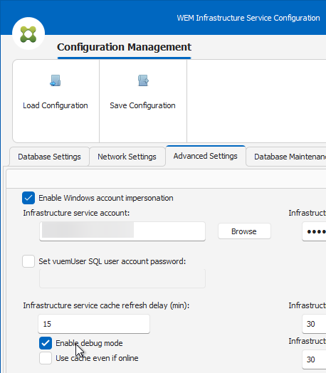 WEM Infrastructure Service Configuration Utility Advanced Tab